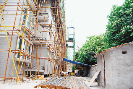 大兴善寺弘阔法师告诉记者,寺院西墙外四五米处已被规划为市政道路。谁知2011年3月初,辛家坡村竟在这里将5年前盖好的楼顶揭开,加盖起“空中楼阁”来。