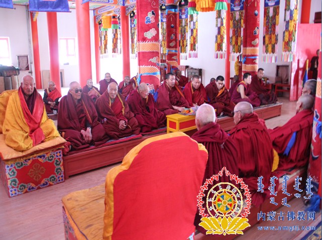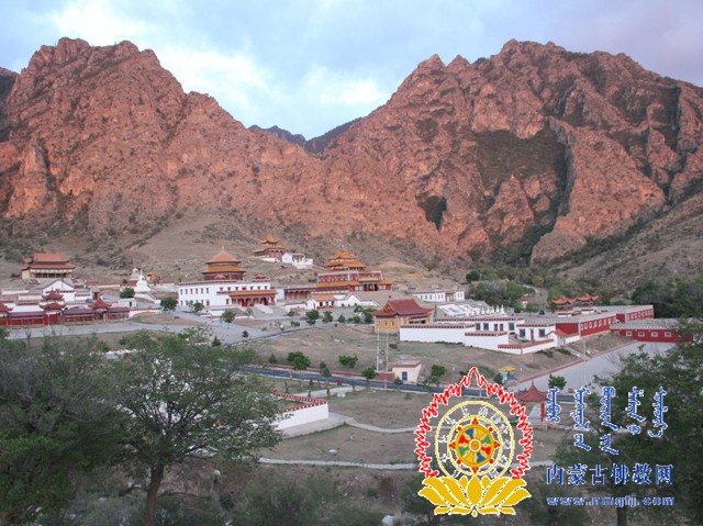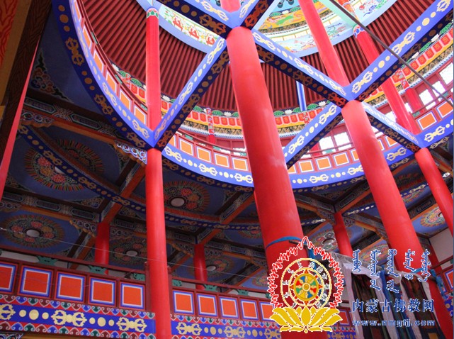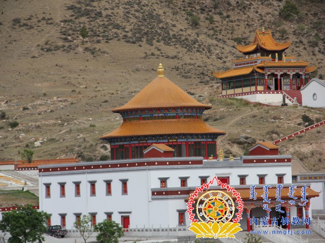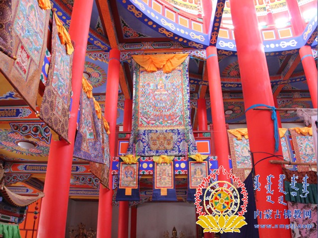 位于阿拉善左旗境内贺兰山主峰巴音森布尔西北侧广宗寺经过三年的建设,阿拉善广宗寺大经堂,最近建成投入使用。大经堂顾名思义,是全寺最大的经堂,是全寺僧众聚会诵经、举行各类法会的大殿,也是进行大型重要法事活动的主要殿堂。因此它是寺院最重要的设施之一。该大经堂主体建筑外形采用藏式正方形双层经堂样式,庙顶为黄琉璃瓦覆顶的圆形重檐顶,外形与承德普乐寺旭光阁的圆顶像似,形成方圆结合的三层殿堂。顶部的金宝瓶置于莲花座上,双层圆顶象征伞盖和胜利幢,前面置金法轮和雌雄吉祥兽,配以金鱼和吉祥结图案装饰,每天在经堂上吹法螺。这样吉祥八瑞汇聚一殿,又呈现出方圆结合(天圆地方)的文化内涵。殿内栋梁和柱子构成大威德金刚内坛城图案。庙顶宝瓶做成镏金的本巴瓶形状,内装般若经和密集本续,以祈愿佛法永驻,众生平安。