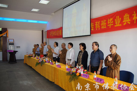 参加今毕业典礼的领导有中国佛学院张厚荣副院长,教务主任理证法师。江苏省宗教局沈祖荣副局长,宗教一处李华廷副处长。南京市民宗局张卫萍副巡视员,南京市佛教协会马荣恩副会长。南京灵谷寺传静法师。