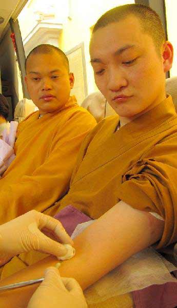 活动当日,一袭黄衫的玉佛寺法师在众多献血人群中显得格外显眼。他们一个个上献血车捋袖献血。献完血,又纷纷上街向香客和过往人群宣传无偿献血知识和理念。