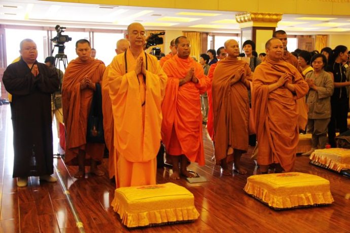 在龙泉寺见行堂,学诚法师率龙泉寺二序大众为贵宾们举行了隆重的接驾仪式。帕· 达摩孔莎瞻长老一行也以巴利语梵音清凉赞佛。赞颂结束,宾主合影后一起来到明心阁,做了亲切交谈。