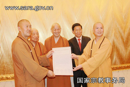 合影留念(从左至右依次为:妙江法师、性空长老、净慧长老、蒋坚永副局长、达义法师)