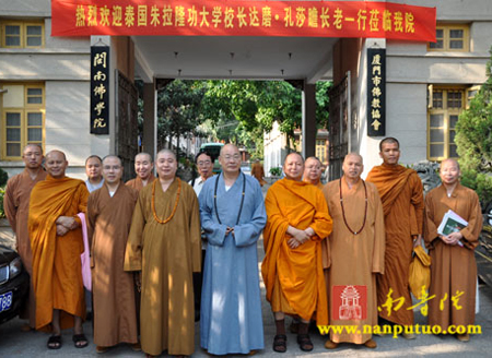 2011年7月5日上午9时20分,泰国摩诃朱拉隆功大学达摩·孔莎瞻校长一行飞抵厦门,在高崎机场受到了福建省佛教协会副会长、厦门市佛教协会会长、闽南佛学院院务委员会副主任、南普陀寺方丈则悟法师,闽院常务副院长、南普陀寺监院界象法师,闽院副院长法源法师、传明法师、净心法师等的热情迎接。