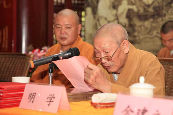 典礼由本届毕业学僧悟德法师主持并代表全体毕业学僧发言,宗泽法师代表书院全体法师发言。明学长老作为寒山书院的院长,在毕业典礼上做了重要开示,他勉励学僧们要以弘法为家务,荷担如来家业,把书院的精神播撒到社会各个角落,并嘱咐大家要饮水思源,知恩报恩,常回书院看看。鲍蜀生副处长、金建立局长、张武国处长、普仁法师、陈建华副秘书长也分别在典礼上做了重要讲话。金建立局长在讲话中指出:爱国爱教是佛教的优良传统,希望大家能发扬这一优良传统,为国家富强、社会和谐做出相应的贡献。