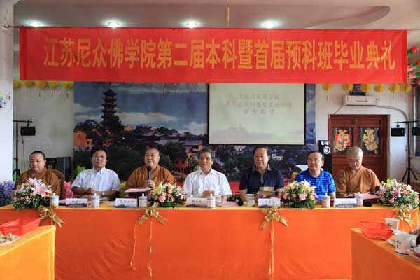 出席毕业典礼的领导及嘉宾有:江苏省佛教协会副会长、南京鸡鸣寺住持、江苏尼众佛学院院长莲华法师,南京市佛教协会副会长马荣恩先生,南京市佛教协会秘书长朗明法师,南京大学中华文化研究院院长、江苏尼众佛学院院长赖永海教授,南京大学哲学系主任白欲晓教授,南京大学哲学系教授杨维中教授,以及佛学院全体法师、老师、鸡鸣寺两序大众等共200余人。