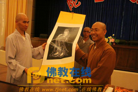 最后,杭州佛学院华梵法师与普陀山佛学院智宗法师分别代表双方院校互赠礼品。(杭州佛学院供稿)