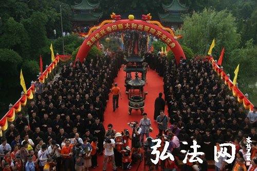 上午9点,龙兴寺住持印顺大和尚抵达山门口。由龙兴寺监院明广法师率众于山门口香案前恭请住持和尚晋院。在仪仗队引领,大众簇拥下,印顺大和尚与各界领导一起至龙兴寺观音阁大门,为龙兴寺揭牌。接着,由印顺大和尚致辞,他说:“深圳佛教界接手龙兴寺的管理是国家宗教自由政策的体现;适逢国家昌隆,深圳喜迎大运,佛教界理当倾情尽心为大运的圆满成功祈福,这是佛教界的荣幸,也是大家共同的心愿 ”。