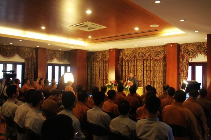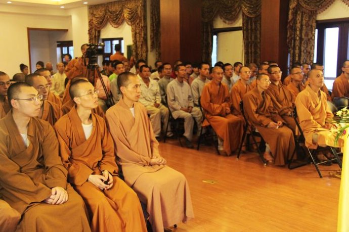 法师特别说起净律寺的学佛院,那是忏云老和尚创建的。老和尚毕业于当时的北京佛学院(中国佛学院的前身),认识到佛学院偏重于教理的研究,而佛学在日常生活中的落实就显得不足。老和尚强调解行并重,所以就命名“学佛院”。 法师感到十年来,中国大陆佛教发生了翻天覆地的变化。尤其看了龙泉寺五周年的大事回顾,感叹龙泉寺从无到有的艰苦创业非常不易,要有相当的毅力和恒力。台湾佛教实际上也经历过类似的开山过程,通过上一代老法师们的努力,现在基本上把硬体和软体建设起来了,所以台湾的这一代法师主要是守成。不像大和尚在这边做这种开天辟地的事业,一定会在历史上留下浓浓的一笔! 关于修行的次第,法师说:整部华严经就是在讲成佛的次第,从信到解到行到证。我们这边学的《广论》也是很讲次第的。大家为什么信佛,常常也说不出什么原因,这就是一种宿世的善根,潜意识的波动。见到三宝自然很欢喜,表示过去生种下了善根——信心的种子,就是依着信心的善根入佛门。但每个人的因缘又是千差万别。龙泉寺有一个很好的学佛次第和方法。但是,不一定每个人都有这个福报,他本身很想了解佛法,但是没有环境和助缘,所以他一直停留在依着过去善根的那种微软的信心上。 假设想要到达第二个阶段去深入了解佛法的时候,可能遇到障碍烦恼的时候,就会退转。因为过去的善根的力量是比较薄弱的,要经过今生的努力加强善根的种子,所以第二个阶段要次第的学习佛法,此时完整的了解佛法是很重要的。没有完整的了解佛法就好像闭着眼睛走路,会很危险,也易走偏差。所以解的部分是帮助我们深信佛法。经典里讲“闻经、达理、断疑、生信。” 信心如何坚固哪?透过佛陀、祖师的法语开示,学习理解通达这些道理,这个过程就能把内心的那个疑惑一个一个断除,所以这个信心才比较坚固。理解之后再进一步的实修,验证所理解的佛法,所以解同行要并进。否则所解只是停留在文字或者知识的层面。所以这个智慧一般是由闻慧入思慧,再进一步达到修慧,修慧时就会慢慢有证悟的境界出来。首先培养这种禅定的基础,禅定要去修证,就是培养定力。观就是培养观照的智慧,有定力的时候观照佛法的道理,乃至宇宙人生的真相,就能够比较观照的清楚,也即止观双运。禅定同智慧是相辅相成的,智慧是灯,禅定御风,实相是画,定慧要等持。风就是内心的妄念、分别。而这一切的基础就是戒,戒是各宗的地基。否则,很难成就甚深的禅定和智慧。修行人就是修定慧这两样,直到圆满。禅宗见性也即是见到心性的本来面目,就是成佛之后的这个中道——实相智慧。但见性后,还要趁性起修;修之后,还要断这个烦恼,还要证。另一方面通过教理的研究,也可以从文字语言中慢慢理解乃至悟到心性的本来面貌。等到修到一定的时候,就会有些修行的证悟。所以依着经典,才会有保障,就可以检查是不是符合佛陀教的道理。 蕅益大师依着智者大师的法华三大部《法华玄义》《法华文句》《摩诃止观》,抽出精华作了一部《教观纲宗》,就是一个佛法概要。所以对佛法的整体概括有所了解后,我们再学一部经典时就能从全貌的角度看待这部经典,才不会被这一部经限制住,就不会学了这一部就不能再学其它的。比如学阿含的思想,再来看般若的思想就不太一样,方等经的思想同阿含的思想差别更大。所以学习佛法要先从整体上概要性的了解,再根据个人的兴趣爱好,个别的深入,就能避免因偏差产生的执着。法本身没障碍,是我们人的问题,自己把自己的障碍住了。理论上听起来很简单,但要真正达到需要三大阿僧祁劫,还同个人的精进度有关。 虽然外面酷暑难耐,但法师一直和缓清晰地侃侃而谈,没有一丝躁急,如同涓涓清泉。这就是内心定力的生动体现吧! 自由交流时,同学们纷纷提问。 贤冰师:请法师介绍一下学佛院在净土法门的解门以及修行上是怎么样的? 净心法师:净土的部分,主要依据的经典是五经一论。但是,就思想来讲,是依藕益大师《阿弥陀经要解》的思想,以及印光大师的净土思想为主。研究过藕益大师《阿弥陀经》要解的人知道,在序分、正宗分、流通分,他都是紧扣三个主题——信、愿、行三资粮。信有“六信”——信自、信他、信事、信理、信因、信果。藕益大师在用天台宗的思想解释《阿弥陀经》时,很重视信自和信理。如何使自己的心与阿弥陀佛感应道交?三个力不可思议:佛力、法力和心力。阿弥陀佛的名号虽然只有四字或者六字(洪名),但它具足了阿弥陀的法身和净土的功德。众生的心性功德力本来也是不可思议的,只是被无明妄想所覆盖而不能显现。祖师比喻:阿弥陀佛的愿力像天上的月亮,是如如不动的。但众生像地上的水,你要把水准备好——把条件具足,才能在你的心中映现出天上的月亮,才能感应道交。否则,阿弥陀佛再大的愿力,也不能强迫众生往生到他的极乐世界。如果你偏重他力时,对自己的要求就会降低。但是,如果你平时就没有正念,临终时怎么可能正念呢!印光大师赞叹藕益大师的《阿弥陀经要解》,即使“古佛再出于世,重注其经,亦不能高出其上矣!” 法师还说净土法门是要有理论基础的,不是说一厢情愿地相信就可以,这样的信心是很容易退转的。在具体方法上,法师谈到了《大势至菩萨圆通章》中的“都摄六根,净念