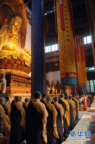灵隐寺近百位僧人在大雄宝殿举办祈福法事为妞妞祈福