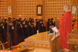 25日下午三时,大家便陆陆续续的报到,在引礼法师的带领下,在大雄宝殿进行规矩说明及过堂讲解,随后由引礼法师带领朝山,在三步一拜中,大家虔诚的朝至自已的灵山塔。