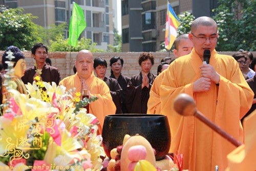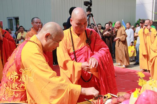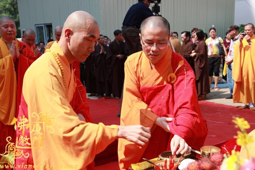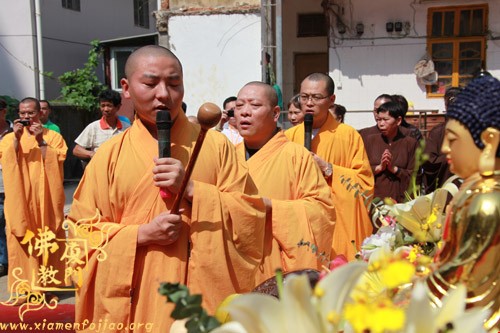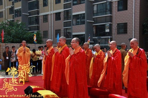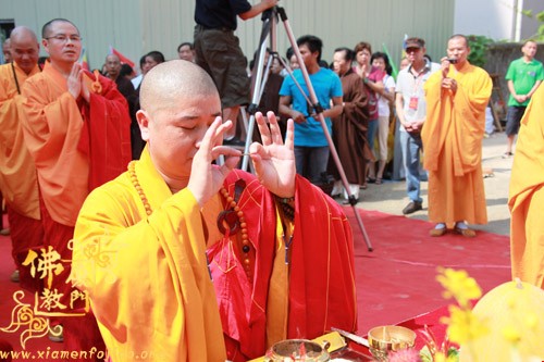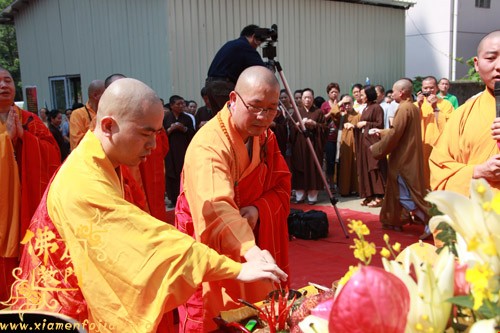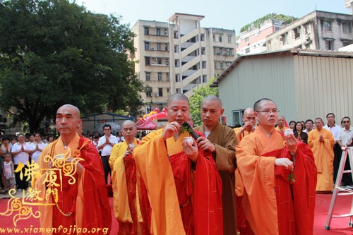 奠基仪式由虎溪岩寺知客向协法师主持,首先全体起立奏国歌,相关领导及护法居士讲话后,南普陀寺维那兼知客圆满法师带众诵经祈福,诵经法会由各位高僧大德主法,随后开始了隆重的奠基仪式。
