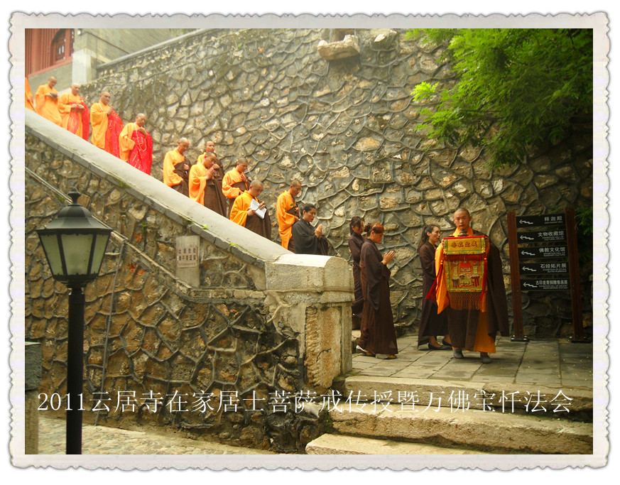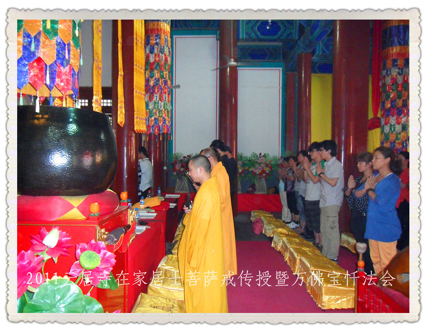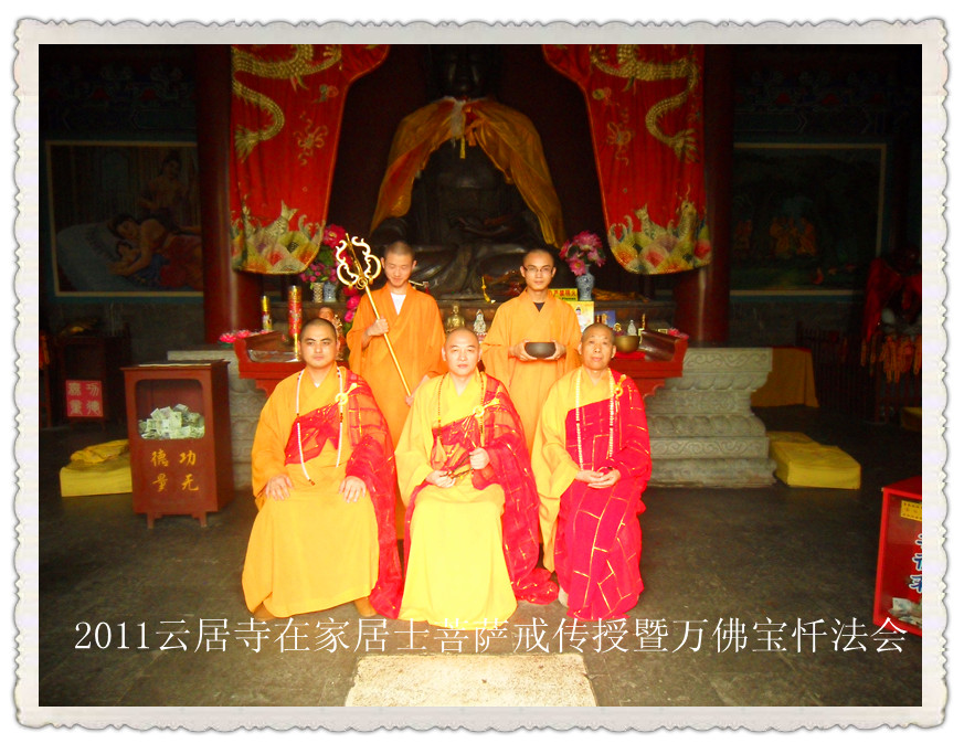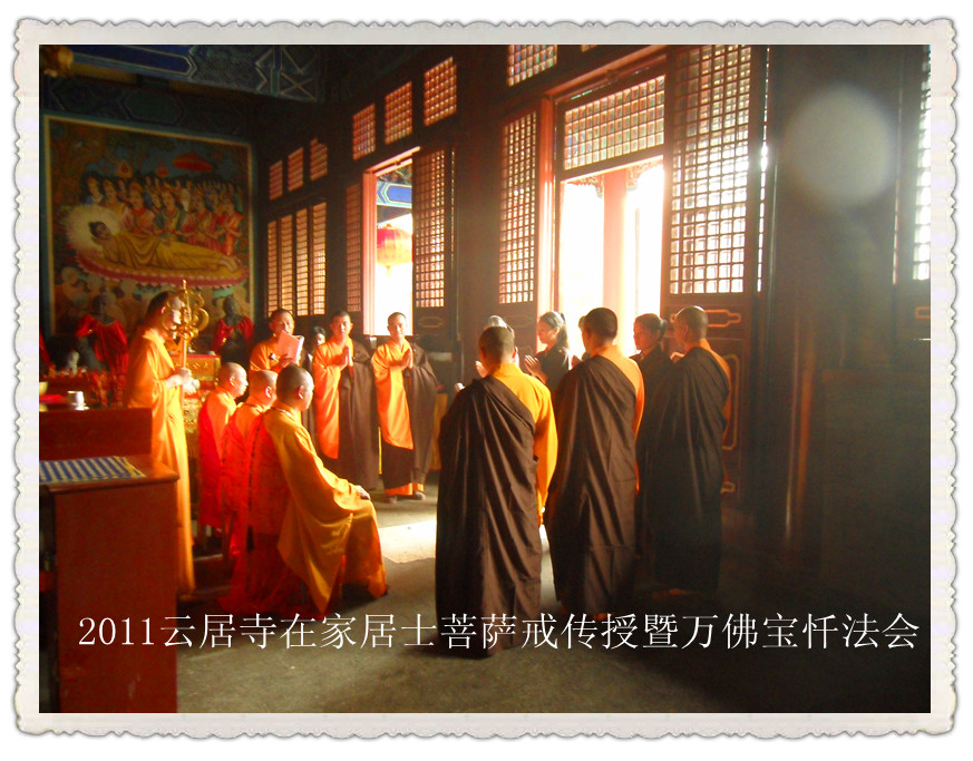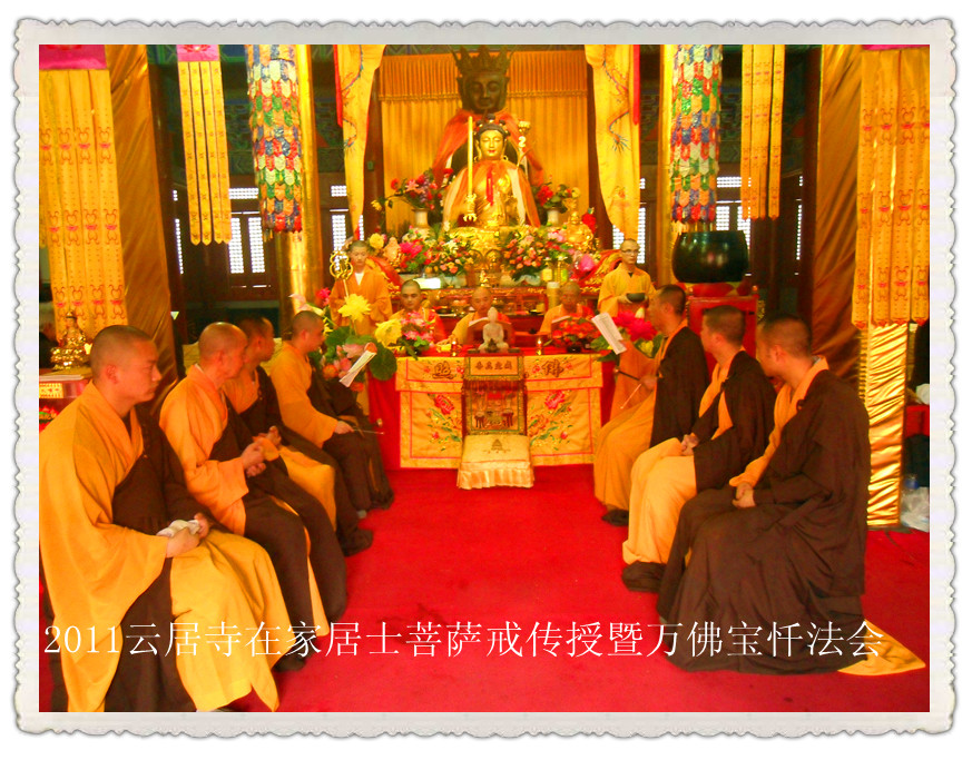 为祈正法久住,续佛慧命,引导正信,导归正觉,北京云居寺于2011年7月16日至19日举办了万佛宝忏暨在家居士授菩萨戒法会。礼请本寺监院果坚法师为得戒和尚,常固法师为羯磨阿阇黎,持扬法师为教授阿阇黎,道圆法师为引礼师。