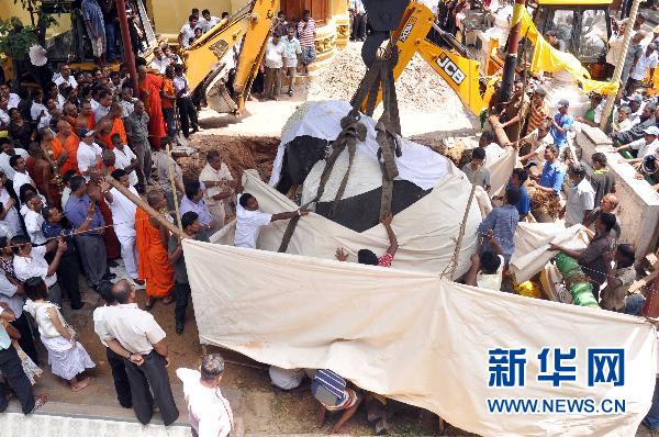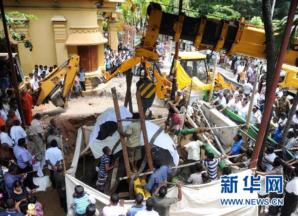 7月8日,在斯里兰卡首都科伦坡的一座佛寺,起重机将一头大象的遗体吊到墓里。这头名叫拉贾的大象今年55岁,当地寺庙每年的巡游大典都由它驮着佛骨舍利塔,至今已有20多年。新华社/法新