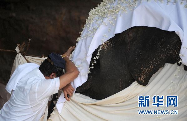 7月8日,在斯里兰卡首都科伦坡,人们在下葬一头55岁的大象。这头名叫拉贾的大象今年55岁,当地寺庙每年的巡游大典都由它驮着佛骨舍利塔,至今已有20多年。新华社发