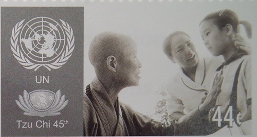 联合国邮政总局发行的四张纪念邮票图样上有肤慰长者、抚慰病苦、关心学童及推动环保分别代表慈济慈善、医疗、教育、人文四大志业。邮票中证严法师肤慰的小女孩蔡宜庭为拍摄于2000年九二一震灾后,慈济援建五十所学校中延平小学二年丙班班长。当年证严法师为五所学校主持动工典礼,二年丙班的导师曾彩琴带著班长蔡宜庭上台,将全班学生写的感恩卡片献给证严法师。蔡宜庭当时很紧张,曾老师一直摸著她的脖子给她打气,并向法师说明来意。此时,证严法师举起左手,用掌心贴著宜庭的胸口安抚她不要紧张慢慢说,疼惜的画面令人动容。(图、文:葛传富、简东源)
