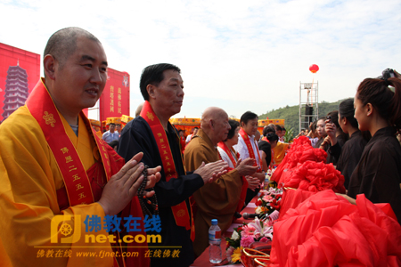 随后,省、市、区和诸山长老、嘉宾共同为金刚万佛宝塔落成进行剪彩。诸山长老、大德法师为金刚万佛宝塔诸佛圣像开光。法会现场风和日丽、祥云显现,礼炮齐鸣、梵音袅绕。