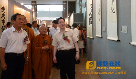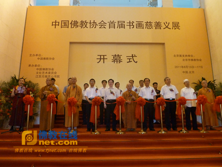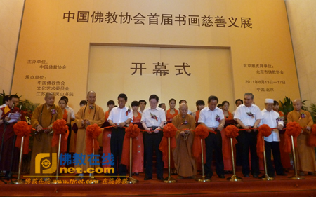 13日上午10时,义展北京展举行了隆重的开幕式。出席开幕式的有:中共中央统战部常务副部长朱维群,国家宗教事务局局长王作安、全国政协民族和宗教委员会驻会副主任邓宗良、国家宗教事务局副局长蒋坚永,北京市宗教局局长池维生。中国佛教协会会长传印长老、副会长学诚法师、秘书长王健,中国伊斯兰教协会会长陈广元阿訇,中国道教协会、中国天主教爱国会等全国性宗教团体负责人,以及北京市佛协、中国佛教协会副秘书长及该会部门负责人,北京市各大寺院的法师和喇嘛,义捐书画家代表。
