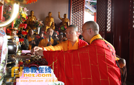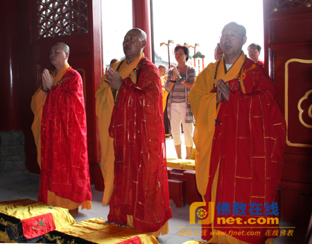 妙江法师(中)、达义法师(左)、隆悟法师(右)共同主法