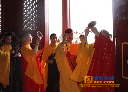 上午9时许,大圣竹林寺千手千钵文殊殿前彩旗飘扬、经幢高悬、钟磬和鸣,大殿前四众弟子列队排班恭候法师。妙江法师、达义法师、隆悟法师三位法师在仪仗队迎请下,到文殊殿内开光主法。妙江法师、达义法师、隆悟法师手持杨枝净水,口诵十小咒,绕洒大殿,令诸善信皆得甘露灌顶加持。随后,三位法师依次唱偈、宣说法语,为千手千钵文殊菩萨圣像开光。