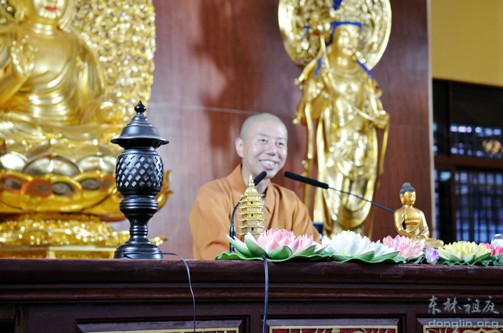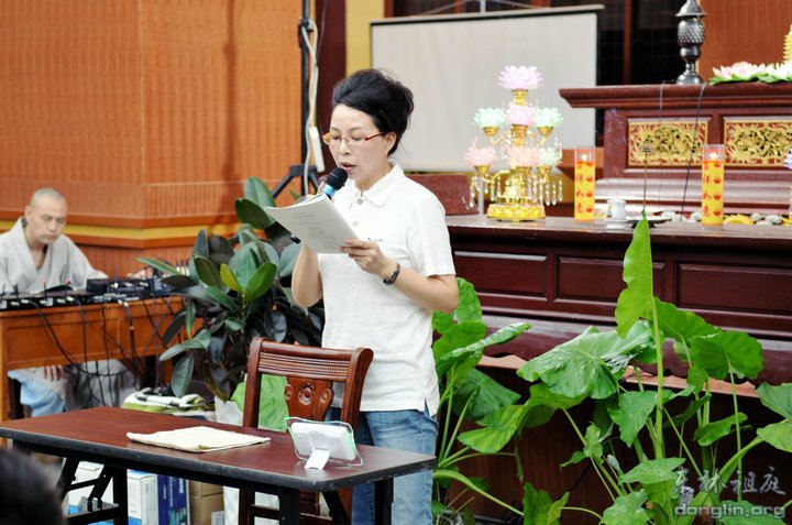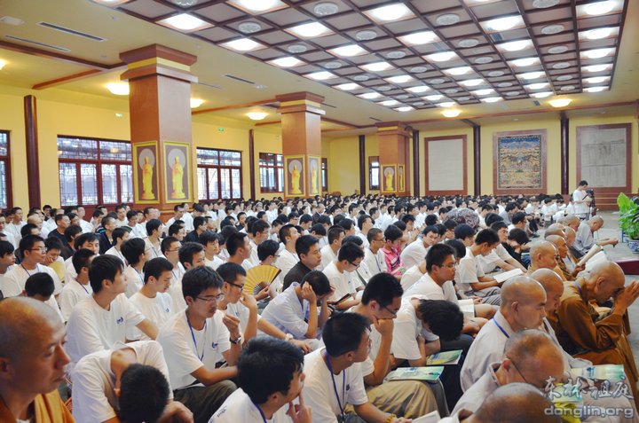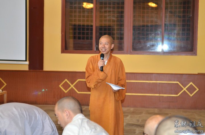 在热烈的掌声中,道元法师笑容满面登上讲台,首先他代表东林寺两序大众,向来自全国各地的青年才俊表示热烈的欢迎。道元法师说,具有1600多年历史的庐山东林寺,是东晋慧远大师开创的道场,是中国净土宗的发祥地,今天大家满怀寻求真理的祈盼,在炎炎盛夏来到东林寺学习净土文化,有善根,有福报!