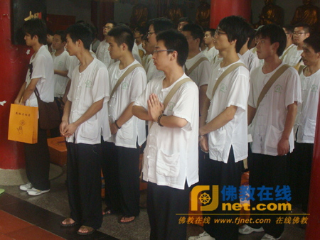 下午2时许,夏令营师生抵达五祖寺,并在五祖寺监院惟道法师和辅导老师的带领下参观了寺院。随后,夏令营师生一行到大雄宝殿上香。礼佛三问讯后,五祖寺方丈见忍法师对禅文化夏令营营员表示欢迎。他说,大家到五祖寺参访并开展活动很有意义,希望各位营员在生活中学习中佛协副会长、四祖寺方丈净慧长老”觉悟人生,奉献人生、善用其心、善待一切”的精神,并将人间佛教落实在给人希望、给人欢喜、给人方便、给人幸福、给人健康、给人快乐。