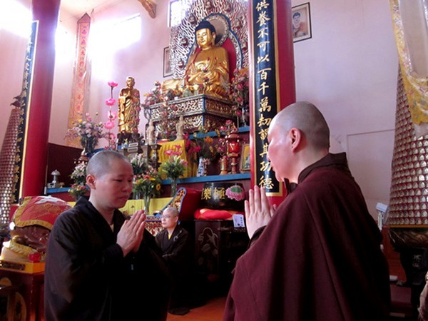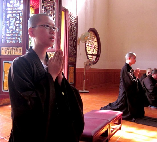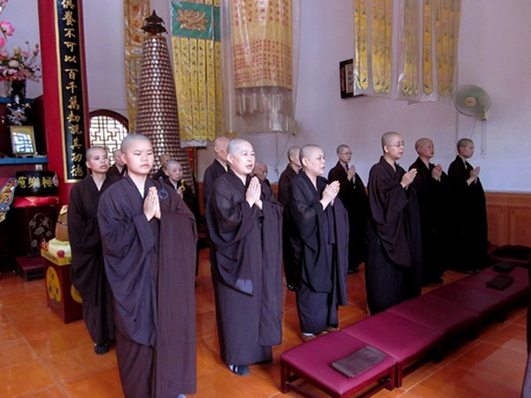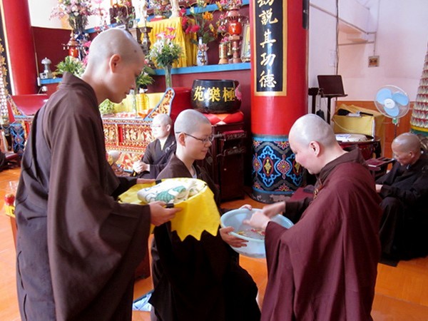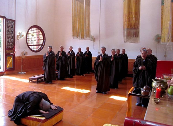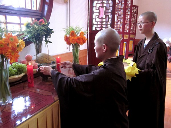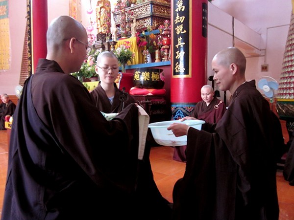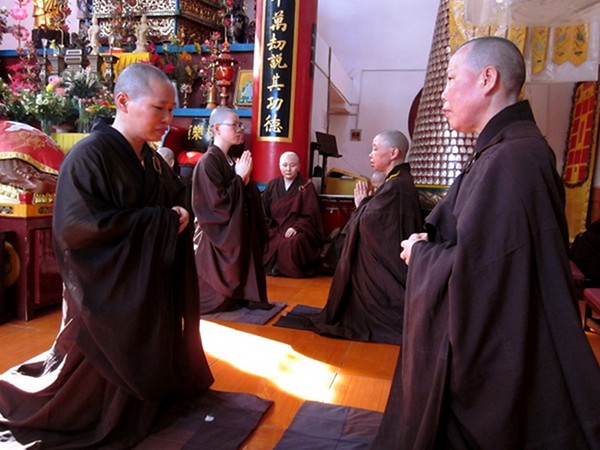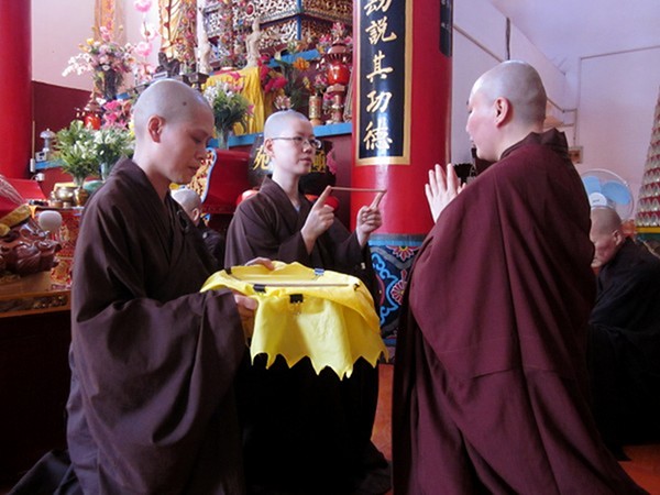 七月十五日下午两点半,全体尼众于大雄宝殿排班就序,进行解夏受筹仪式,于十六下午进行自恣仪式。恩师上人带领所有僧众至诚顶礼诸佛菩萨,感恩三宝慈光加被,韦驮菩萨神力护持,令九旬安居当中无诸障碍。