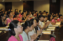佛光山佛陀纪念馆工作人员培训班于2011年8月2日上午举行开学典礼,100位学员展开为期四个月的培训课程。星云大师于此间特地为培训班学员接心开示,“佛陀纪念馆是我的!”星云大师带领学员大声喊出,因为是我的就有力量,勉励学员要往好处想,给人接受。