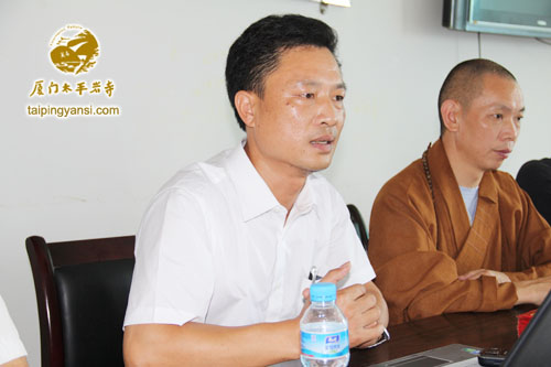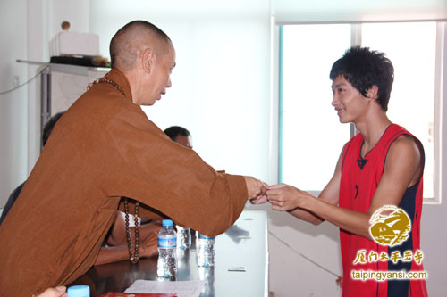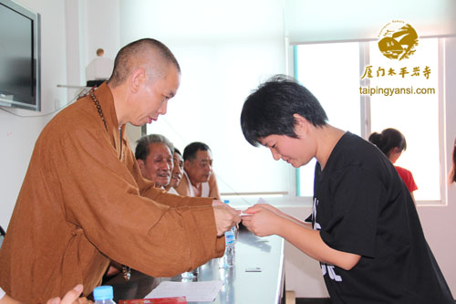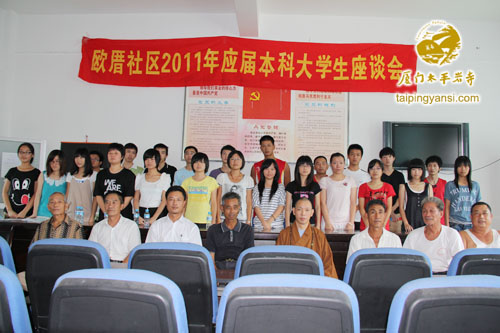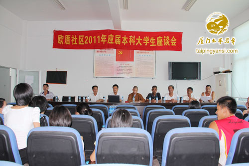 2011年8月26日上午,新学期即将开学之际,厦门太平岩寺、翔安定明精舍、欧厝社区及社区红十字会联合举办“欧厝社区2011年应届本科大学生座谈会”,为今年考上本科的应届生发放奖学金。参加座谈会的人员有太平岩寺、翔安定明精舍住持世澄法师,欧厝社区红十字会会长王浙江,社区居委会代表王金想,老人协会会长王坊添,老人协会秘书长王锐波及社区30名应届本科大学生等人。