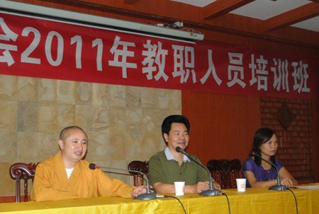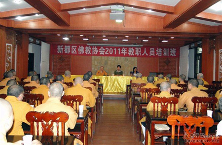 为提高广大僧众的理论水平,加强道风建设,经四川省成都市新都区民宗局同意,新都区佛教协会于2011年8月25日在宝光寺举办2011年教职人员培训班。各佛教场所全体管委会成员、教职人员参加培训班。
