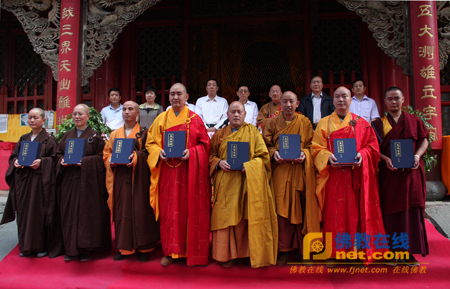 最后,蒋坚永副局长等国宗局、省市领导和根通长老等一同为五台山各个寺院代表们颁发了《文殊圣典》。