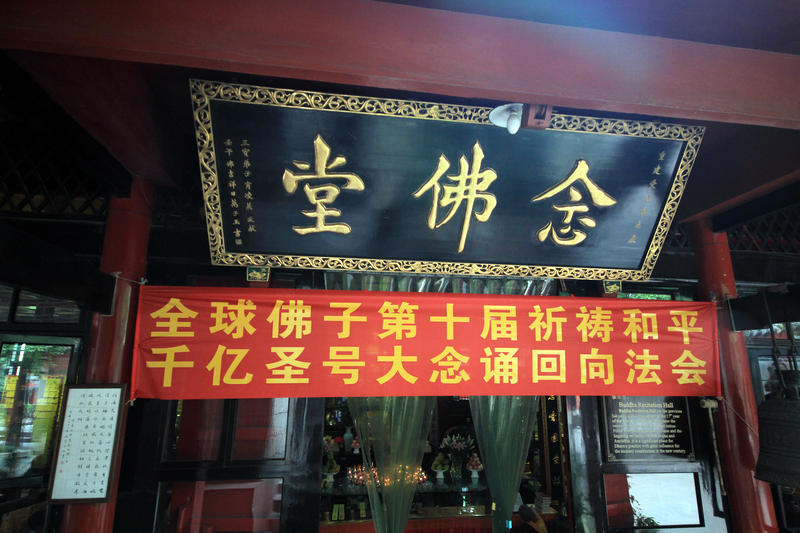 四川爱道堂念佛堂早早的就悬挂起千亿圣号大念诵回向法会的横幅