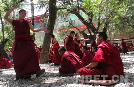 辩经是辩论佛教教义的学习课程。藏语称“村尼作巴”,意为“法相”,是藏传佛教喇嘛攻读显宗经典的必经方式。多在寺院内空旷之地、树阴下进行。