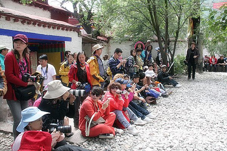 众多来自世界各地的游人用手中的相机去记录下僧侣们的每一个动作,每一个姿势,每一个表情。来自广东的游客姚红艳说,来西藏之前,很多网友便向我推荐,一定要来这里看辩经。虽然语言不通,但我要用手中的相机,把这些经典的画面保存下来,带回去,与我的朋友一起分享。