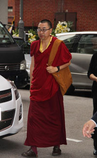 吕良伟父亲吕秉荣先生于上月21日因病逝世,享年88岁。阿吕家人今(8月28日)为其父于世界殡仪馆设灵,上午10时半辞灵,遗体将移奉到哥连臣角火化。阿吕提到父亲的逸事时,不禁伤心难过,双眼通红,怀着不舍之情送别亡父。前来吊唁的圈中人有甄子丹(微博)汪诗诗夫妇、李香琴、陈宝珠、无线高层陈志云,阿吕的前女友郭锦恩也带着女儿来致祭。图为丧礼采用佛教仪式进行。