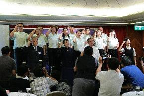 最后三十位大爱艺人、实业家共同演绎“大时代需明大是非、大劫难需养大慈悲、大无明需要大智慧、大动乱需要大忏悔”的手语,呼吁社会大众为台湾祈祷、为世界祈福。(文:郑佩奇、林弘展 图:张进和 林弘展)