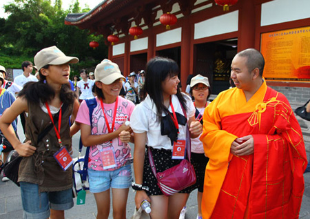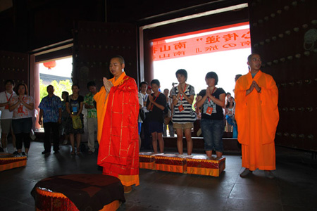 南山寺监院昌厚法师在山门热情迎接参加“阳光海南,爱心传递”疗养活动的100名日本地震灾区学生