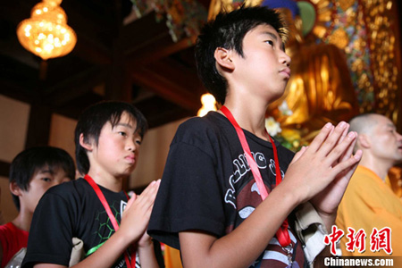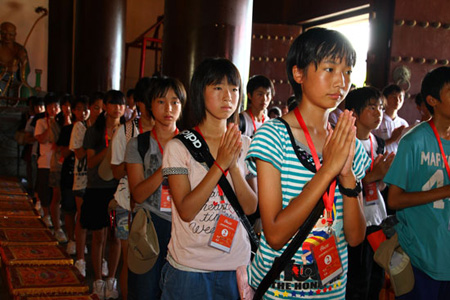 面对佛祖圣像,日本学生双手合十虔诚祈福