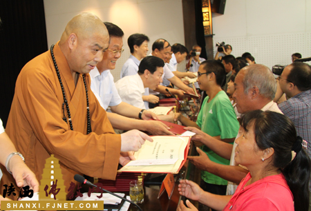 参加发放仪式的还有:省佛教协会秘书长刘进业,市宗教局副局长李社民,市佛教协会副秘书长冯守轩,市委统战部、市宗教局、市教育局有关处室负责人,相关区县宗教局、教育局等部门领导,大慈恩寺僧众及工作人员等。