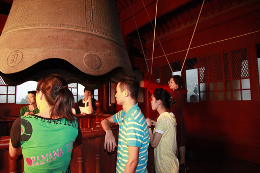 “天童古寺宏伟壮观的钟楼上,六位肃穆庄严的聋哑青年男女,缓缓的迈步向前,走到宏大的铜钟下面,将充满青春活力的双掌虔诚的按在了厚重古朴的钟身上,轻轻颔首.......象是在诉说心中的祝福。随后,他们向旁边一位慈祥的老居士轻轻点头,老居士随即敲响了钟声,宏亮而庄严的钟声顿时响彻在了这古老清幽的千年古刹之中....."