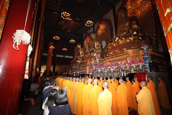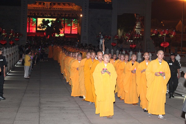晚会圆满之际,由秋爽法师、周向群女士、金明先生、方文浜先生、沈文娟女士、金建立先生共同启动平安、吉祥莲花灯,为晚会点燃了神圣的佛灯。随后,全体法师、居士共同点燃手中的莲花灯,一起念诵“南无本师释迦牟尼佛”圣号,前往观音阁礼拜观世音菩萨。重元寺中秋赏月晚会圆满结束!