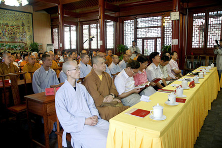 最后,传印长老作开示。他非常赞同学僧代表的发言,希望能把所说的内容落实到行动上,一定要注重最基本的日常行持。另外他还从宏观上开示了认识当前机缘和合的重要性。国家兴而佛法兴,现在正当国家兴旺发展之时,学僧们又处于风华正茂之年,此生幸得人身,幸入正法,应当好好珍惜,前途光明,大有作为。传印长老朴实殷切的话语深入全体后学的心,会场响起发自内心的掌声。