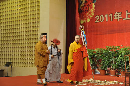 最后的压轴节目是本寺原创小品《玉佛有约》。本寺法师扮演成唐僧师徒和电视访谈节目主持人,在台上引用当前网络热语,以诙谐幽默的语言讨论了当前大众关注的食品安全、慈善等社会热点,表明我们虽身在佛门,但也能心系天下众生,与社会协同发展。