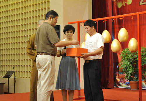 为了感谢各界人士对玉佛寺事业的关心,让更多的人参与到“迎中秋,庆国庆”的活动,增加晚会现场的热闹氛围,本次茶话会首设砸金蛋集体奖项。砸出奖项的代表为一桌人都赢得了奖品,大家都能同喜同乐。