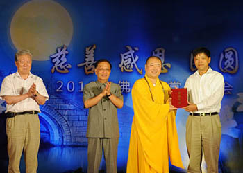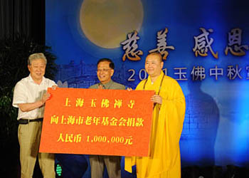 9月9日晚上,以“感恩·慈善·团圆”为主题的上海玉佛禅寺中秋晚会。晚会上,玉佛寺觉醒大和尚代表玉佛禅寺向上海市老年基金会捐款人民币100万元,设立“玉佛禅寺觉群老年基金”,专项用于上海的助老帮困公益慈善事业。
