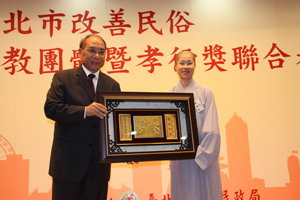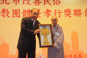 法鼓山长期致力推动慈善公益、社会教化的工作,再度获绩优宗教团体的表扬。8月31日下午台北市政府民政局,假台大医院国际会议中心举行“99年度台北市改善民俗、宗教团体暨孝行奖联合表扬大会”,法鼓山所属团体农禅寺、中华佛教文化馆今年再度获得表扬,均由台北市副市长丁庭宇颁发此殊荣,并由农禅寺常颖法师及文化馆代表监心长老尼出席受奖。