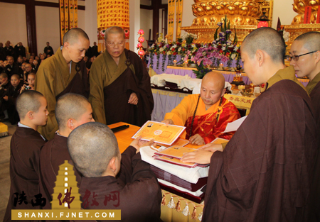 近日,陕西省佛教协会第十届传授三坛大戒法会圆满结束,本次传戒法会由长安至相寺、清凉寺共同承办,自2011年8月19日开始,历时一个月,来自全国27个省市的新戒共600多人参加授戒法会。众戒子以戒为师,谨遵佛制,自觉精进,戒堂内外秩序井然,使得传戒法会顺利开展,圆满殊胜。