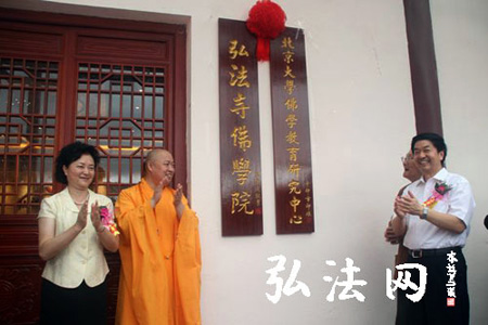 随后,国家宗教局张乐斌副局长、广东省副省长雷于蓝、北京大学楼宇烈教授与弘法寺方丈印顺法师一起为弘法寺佛学院、北京大学佛学教育研究中心揭牌。