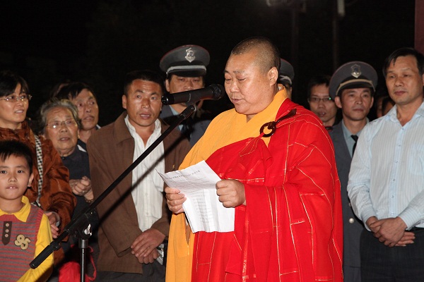 亮灯仪式由隆相法师主持。首先,莲华法师代表鸡鸣寺两序大众向各级领导、社会各界对鸡鸣寺药师佛塔维修加固过程中给予的帮助与支持表达了由衷的谢意,并以佛经中贫女修塔生忉利天的故事来说明十方善信共同成就药师佛塔的无上功德。莲华法师在讲话中还特别对药师佛塔救灾过程中勇敢无畏的消防官兵,以及不畏酷暑奋战在宝塔维修第一线的各施工单位表示感谢。