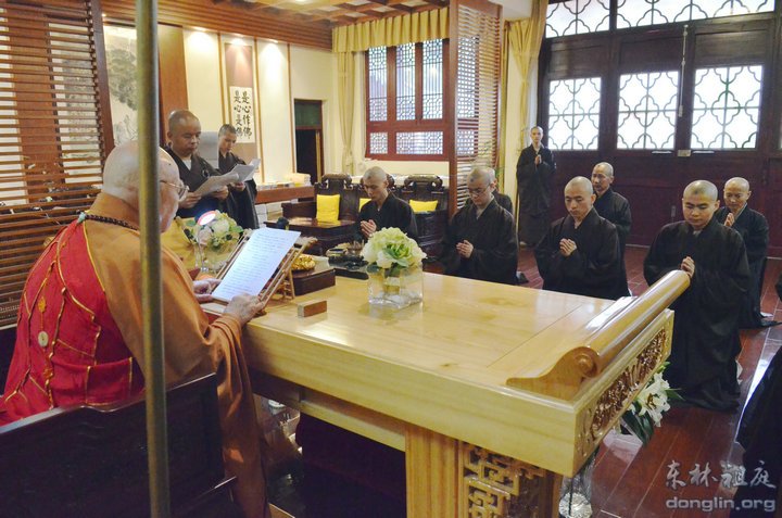 2011年10月15日,(农历九月十九观世音菩萨出家日),东林祖庭将为在家居士求戒大众正式授以菩萨戒法,传授戒法之前传印长老于早晨7时后在丈室为东林寺8位发心出家的净人主持2011年秋季剃度法会。