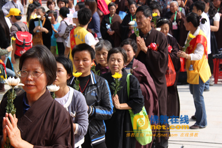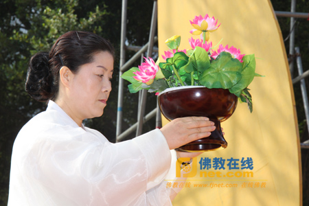 十名身着洁净飘逸的白纱衣裙的韩国居士以虔诚端敬之心向六祖惠能大师敬献香、烛、花、果、糕点、茶,由此拉开了2011禅宗六祖文化节之六祖纪念法会的帷幕。